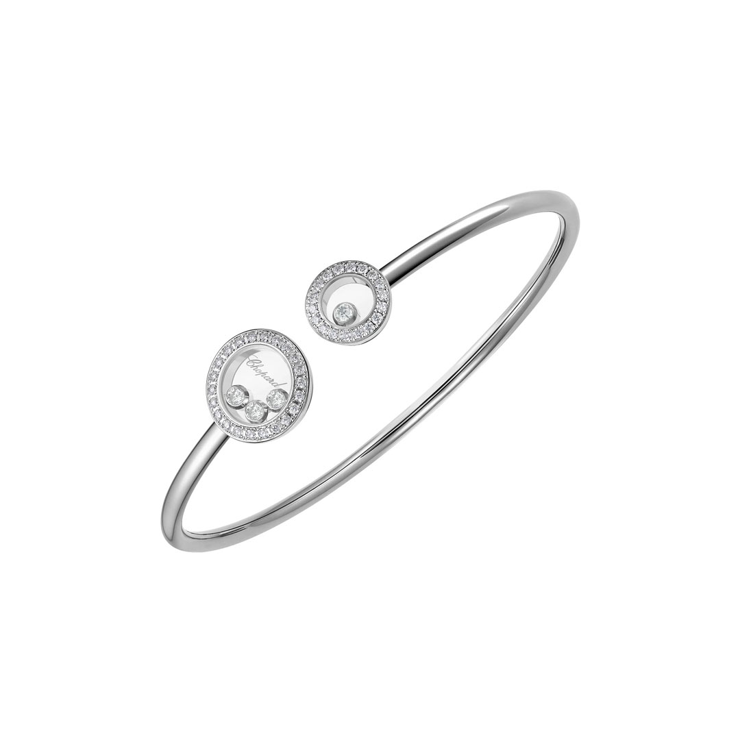 من بين أبرز هذه الموديلات، يبرز سوار Happy Diamonds Icons المفتوح من دار شوبارد Chopard. هذا السوار مصنوع من الذهب الأبيض عيار 18 قيراطاً، ومرصع بألماسات بوزن إجمالي 0.54 قيراط. ما يميز هذا التصميم هو الألماسات المتحركة التي تضفي لمسة من الحيوية والديناميكية على السوار، مما يجعله قطعة فريدة تضفي لمسة خاصة على إطلالتك.