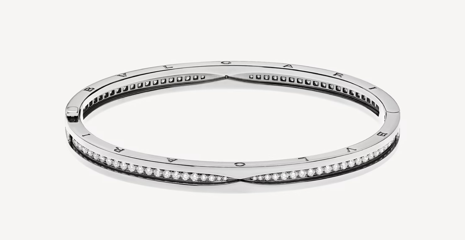 من بين التصاميم التي لفتت انتباهنا، سوار B.zero1 من دار بلغاري Bulgari. هذا السوار مصنوع من الذهب الأبيض عيار 18 قيراطاً، ويتميز بتصميمه المتعدد الاستخدامات الذي يناسب كلًا من الرجال والنساء. تم ترصيع السوار بألماسات بوزن إجمالي يبلغ 1.18 قيراط، مما يضيف له مزيدًا من الفخامة والجاذبية، ليكون قطعة مميزة يمكن ارتداؤها في أي وقت ولأي مناسبة.