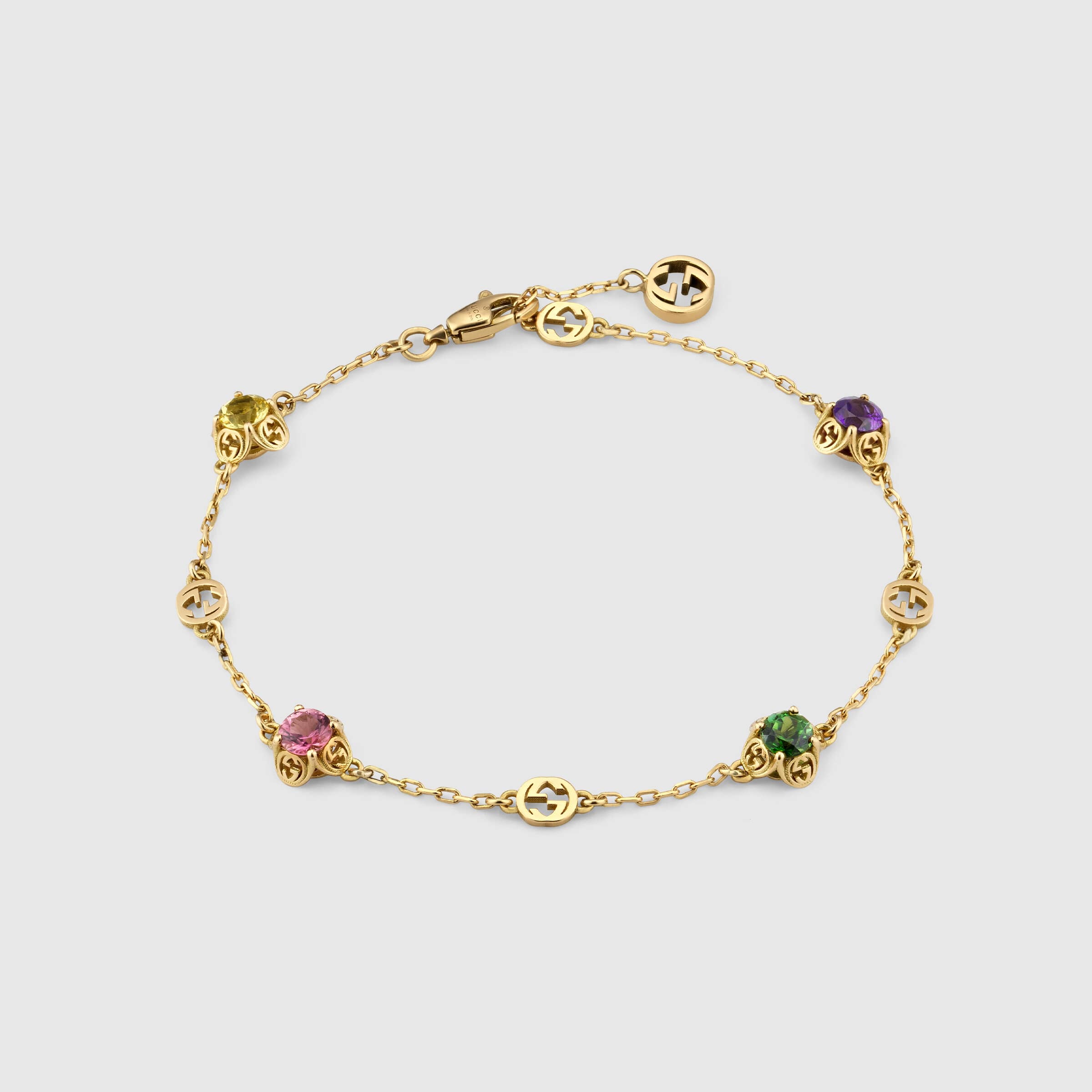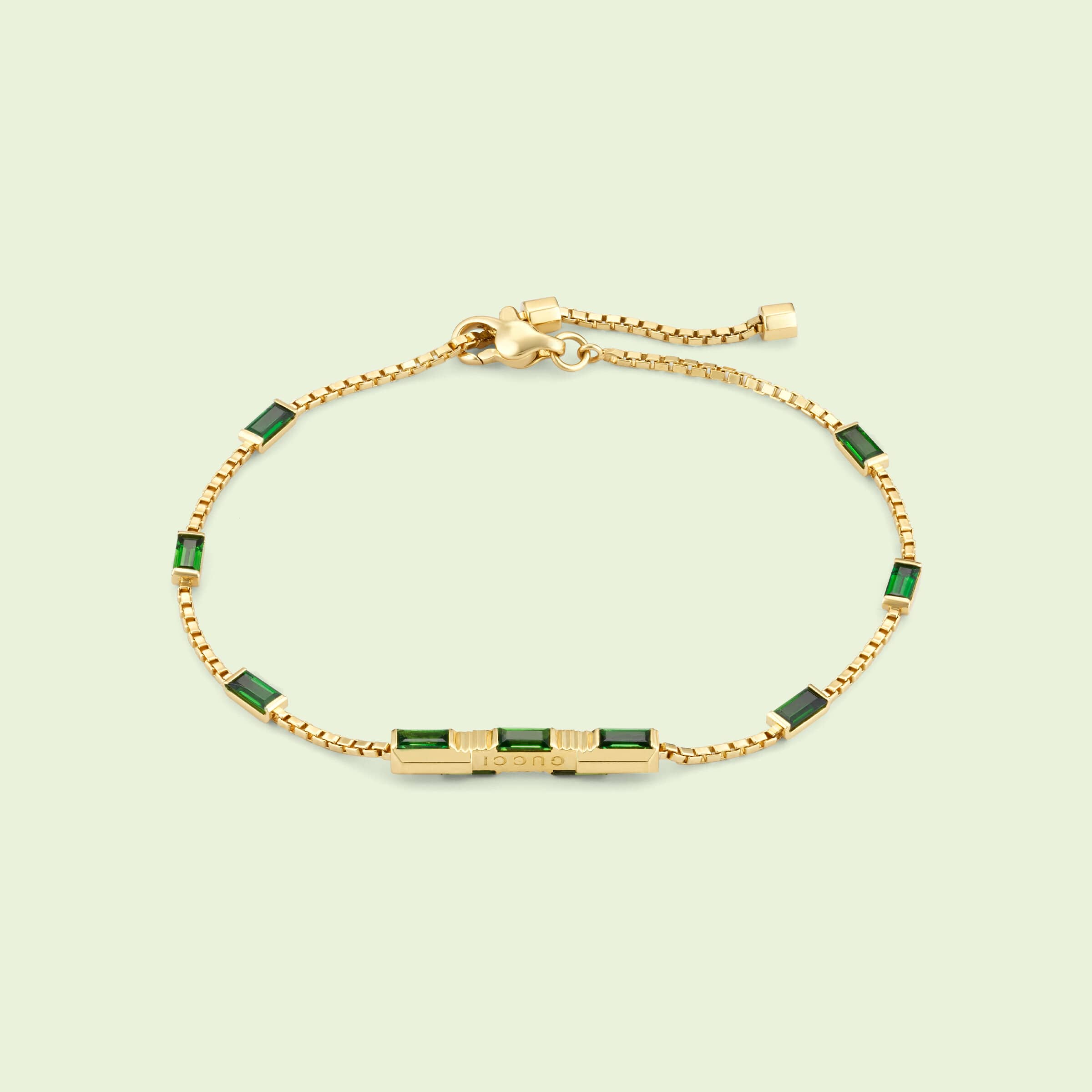 تتجمع العناصر الكلاسيكية فوق هذا السوار المصنوع من الذهب الأصفر، مما يسمح بارتدائه مرارًا وتكرارًا. السلسلة الرقيقة غنية بالأحجار الكريمة التي تمتزج مع حرف واحد فقط من الدار. يكتمل التصميم بحلية G المتشابكة عند الإغلاق.