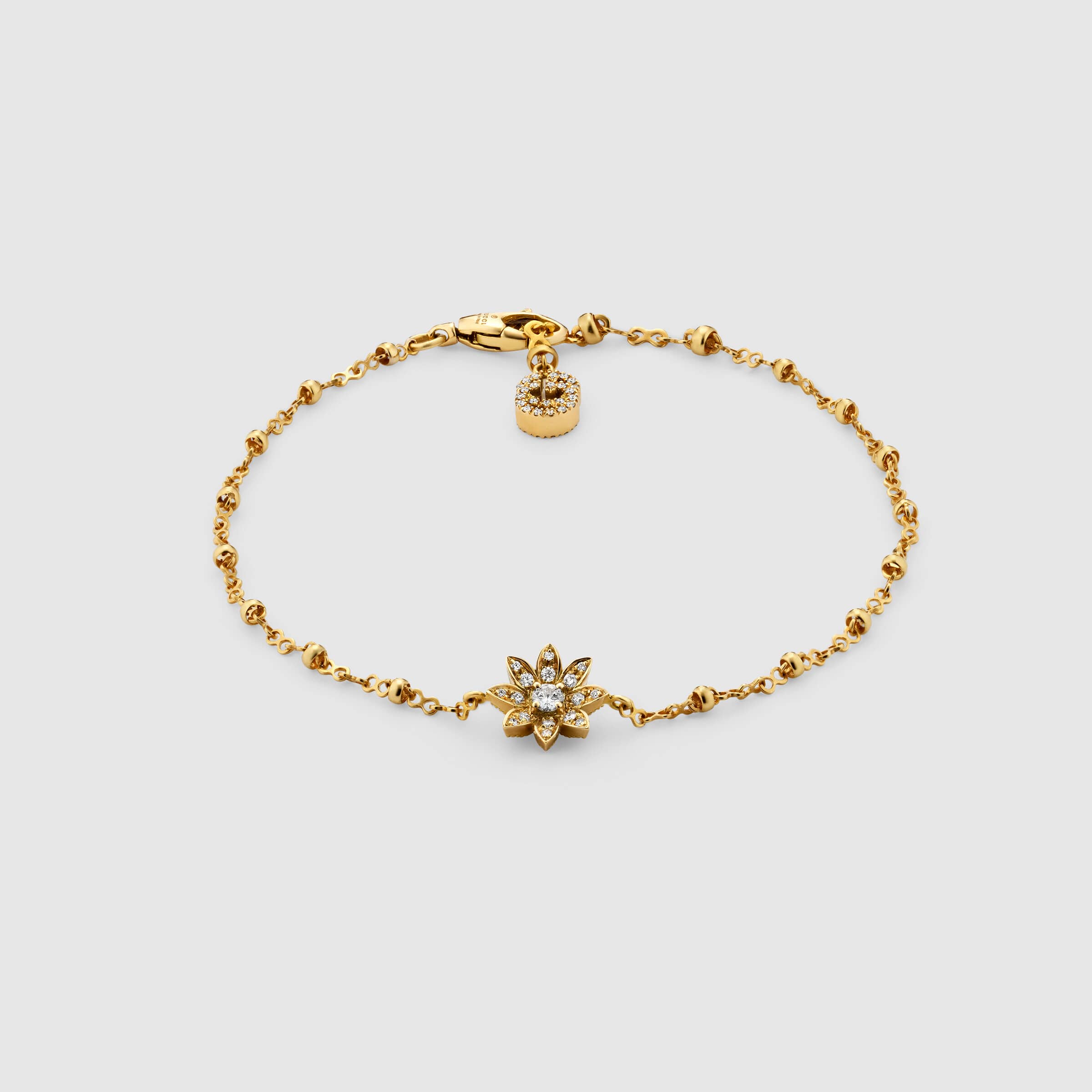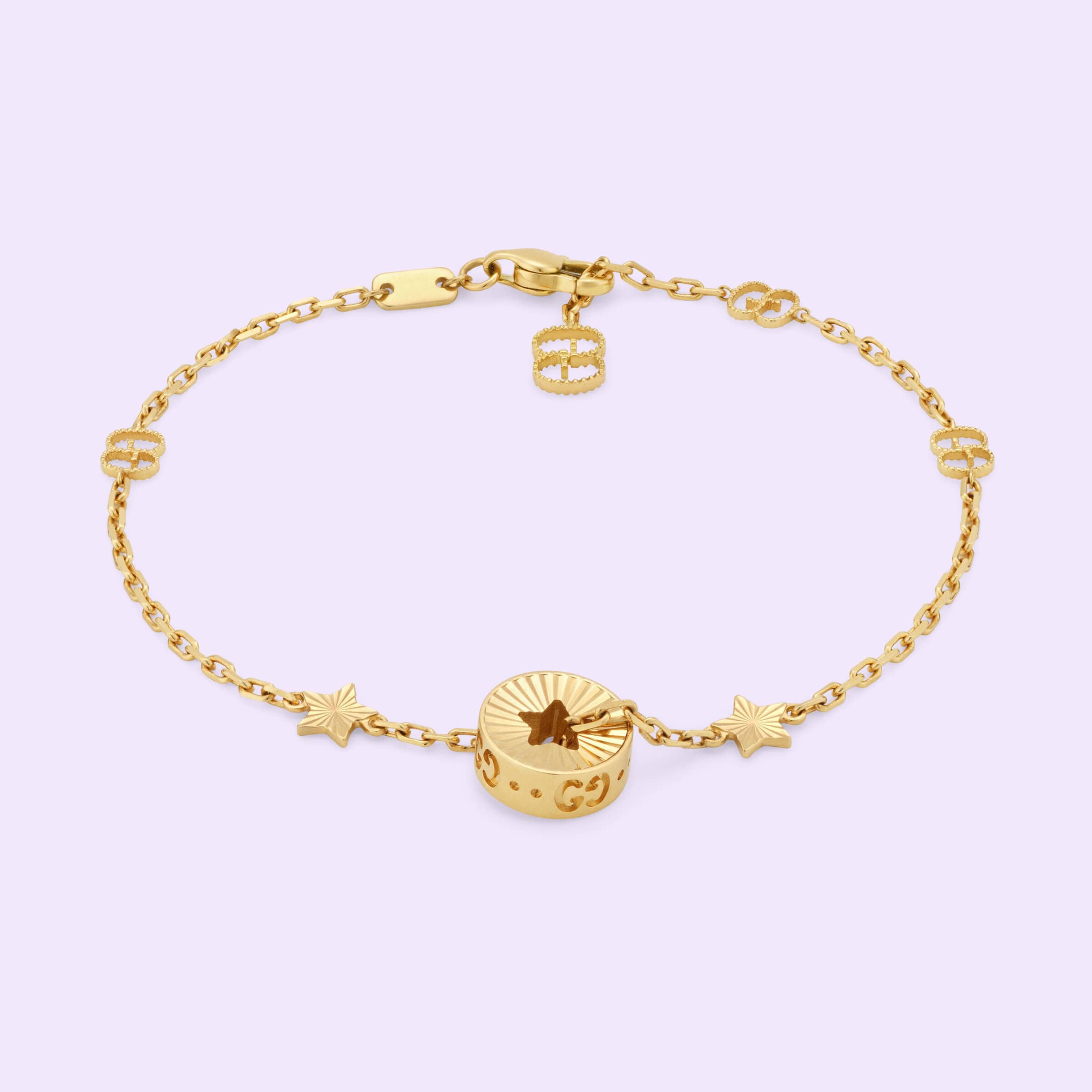 هذا السوار الثمين مصنوع من الذهب الأصفر عيار 18 قيراطًا مع سلسلة دقيقة تحمل شعار GG. النقطة المحورية لهذه القطعة هي سحر دائري يتميز بنجمة مقطوعة.