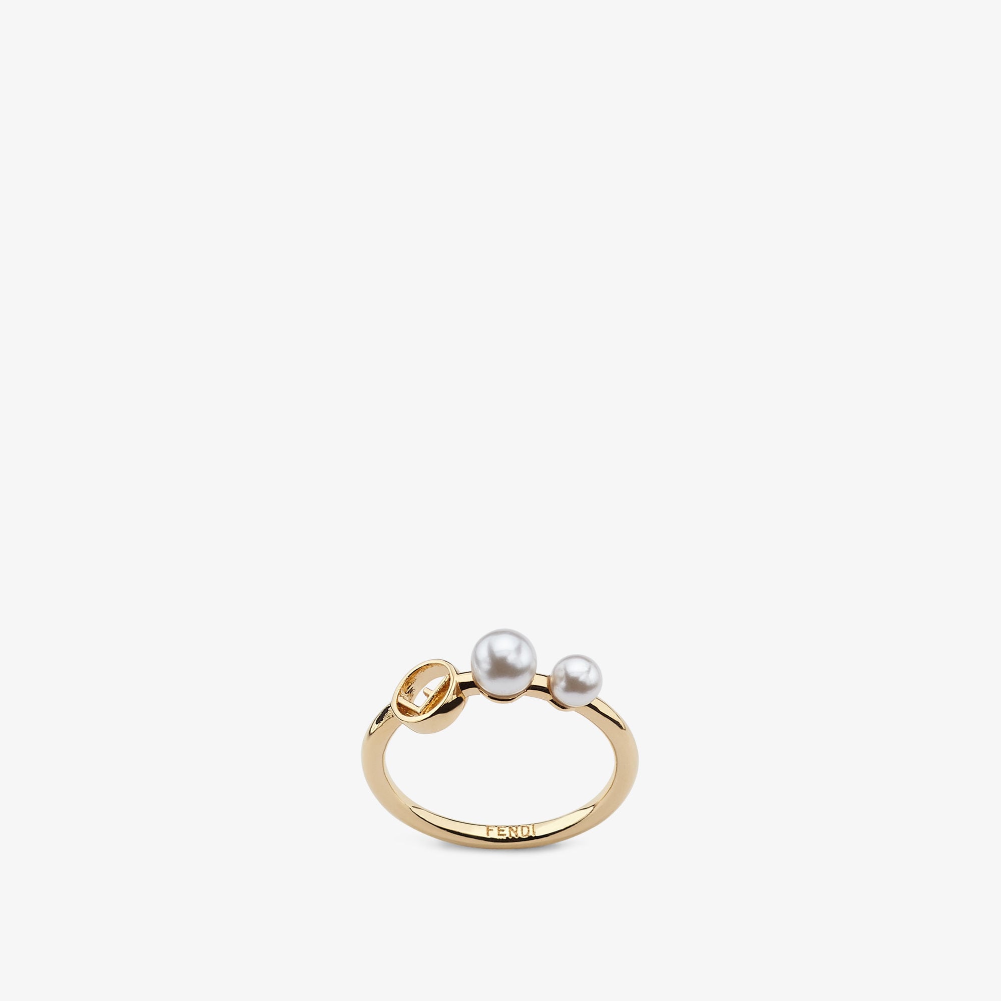 خاتم رفيع بزخرفة شعار فيندي. مصنوع من معدن مطلي بالذهب. مزينة بلؤلؤة بيجو بيضاء.