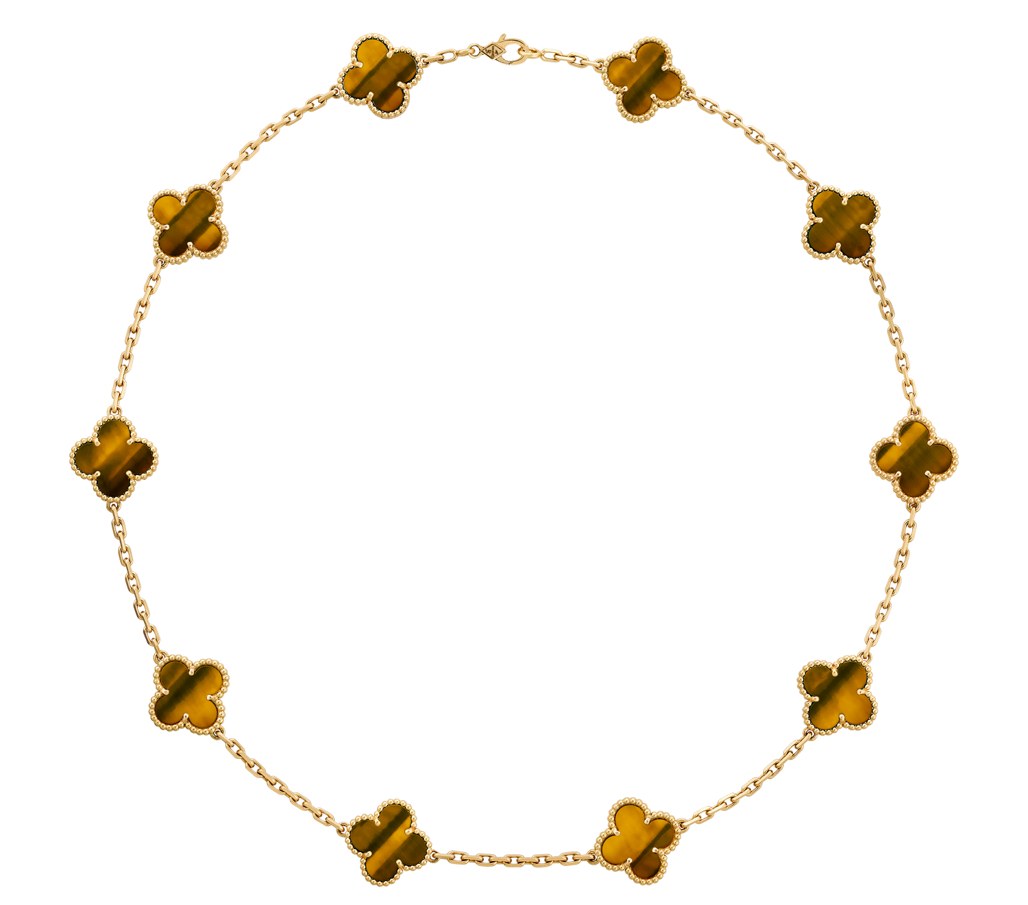تتميز هذه القلادة بتصميمها الأيقوني المكون من عشرة رموز من مجموعة ألامبرا الشهيرة، مصنوعة من الذهب عيار 18 قيراطًا. كل رمز مزين بأم اللؤلؤ الذي يضفي لمسة من البريق الناعم والأنوثة الرقيقة. يُعبر هذا التصميم عن الحظ والسعادة، ويُعتبر رمزًا للأناقة الخالدة.