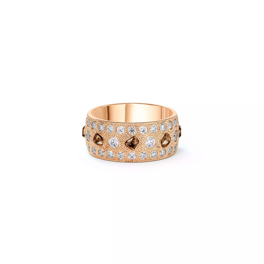 يتميز خاتم “تاليسمان” من دي بيرز De Beers بجاذبية لا تُضاهى، فهو مصنوع من الذهب الوردي عيار 18 قيراطًا، ويتألق بتصميم حلقي مرصع بحوالي 70 ماسة فردية، تتنوع بين الألماس الأبيض والبني المستدير، بوزن إجمالي يبلغ 1.82 قيراط. يجمع هذا الخاتم بين الفخامة واللمسة العصرية.