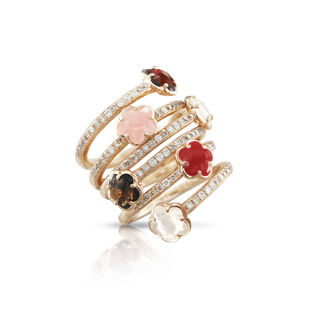 يقدم خاتم “فيليا دي فيوري” Figlia Dei Fiori من باسكال بروني Pasquale Bruni مثالًا رائعًا على ذلك، حيث يجمع بين عدة أحجار كريمة ملونة، بما في ذلك اللون البني في تصاميم ورود ساحرة. يتميز الخاتم بطبقات متعددة من الذهب الوردي عيار 18 قيراطًا، ومرصع بالألماس الأبيض بوزن 0.14 قيراط والألماس البني بوزن 0.46 قيراط، بالإضافة إلى حجر القمر، العقيق الأحمر، العقيق الوردي، والكوارتز الدخاني.