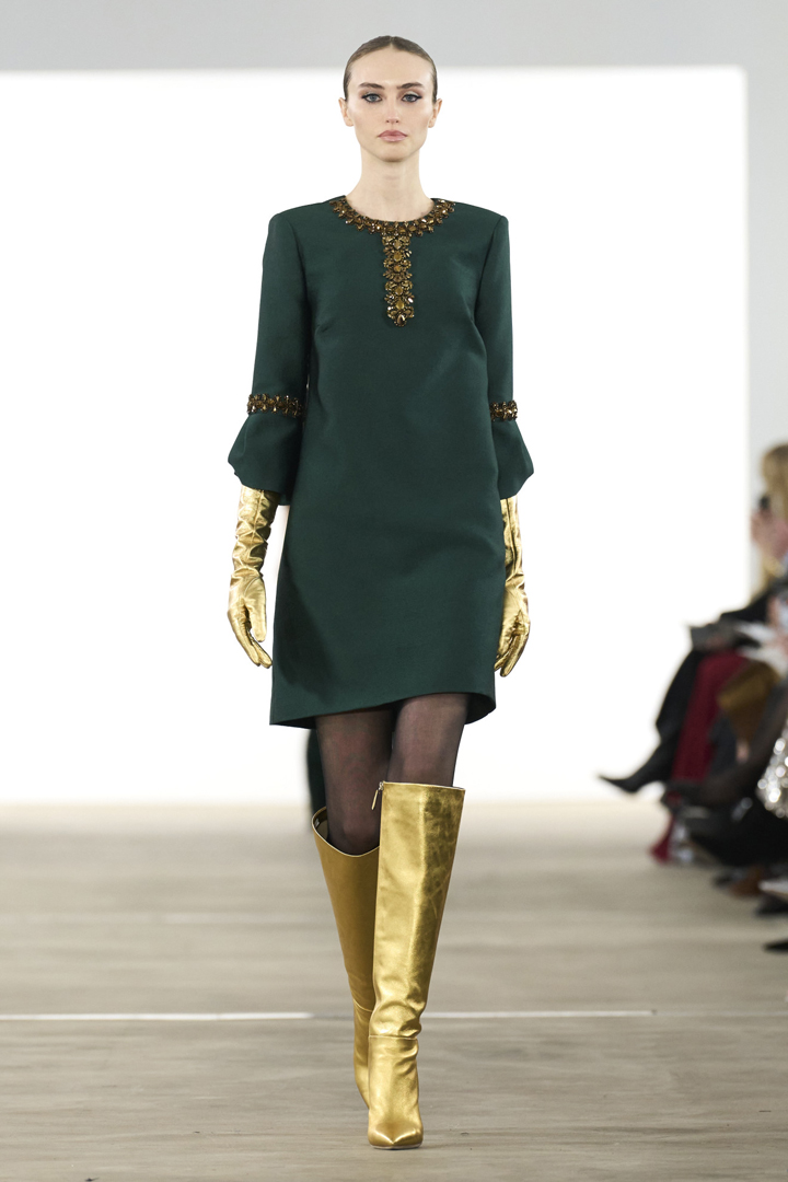 اخترقت الفساتين القصيرة بنجاح منصات عرض أزياء أسبوع نيويورك، مُعرضةً في تشكيلة واسعة من الأساليب التي تنوعت ما بين الإطلالات النهارية والمسائية. الفساتين ذات القصة المستقيمة والمصممة بأكمام ثلاثة أرباع لفتت انتباه الحضور بشكل خاص، مثل الطراز الذي ظهرت به عارضة من بادجلي ميشكا Badgley Mischka، المزين بتطريزات ذهبية راقية على الياقة ومنطقة الكوع. لقد كان التنسيق مع قفازات ذهبية طويلة وبوت ذهبي بتصميم رقبة واسعة تمتد لتغطية الركبة محط إعجابنا.