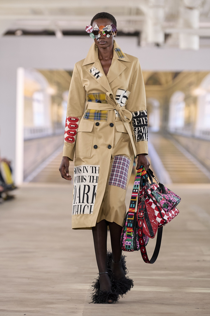 تأنقت مجموعات خريف 2024 بفن الـPatchwork، وهو فن التزيين بقطع القماش المتنوعة الطبعات، مما يضفي على القطعة مظهر “الترقيع”. هذا الأسلوب، الذي يعيدنا إلى عقد السبعينات، زخرف الجاكيتات والمعاطف بشكل لافت، كما في المعطف الترنش بلون الجمل الفاتح من تصميم Libertine. يمكن تنسيق هذا الأسلوب بسهولة لإطلالة نهارية عن طريق إضافة قميص أبيض وبنطلون أسود واسع، مع تكملة المظهر ببوت أسود وحقيبة تُحمل على الكتف لإطلالة متكاملة.