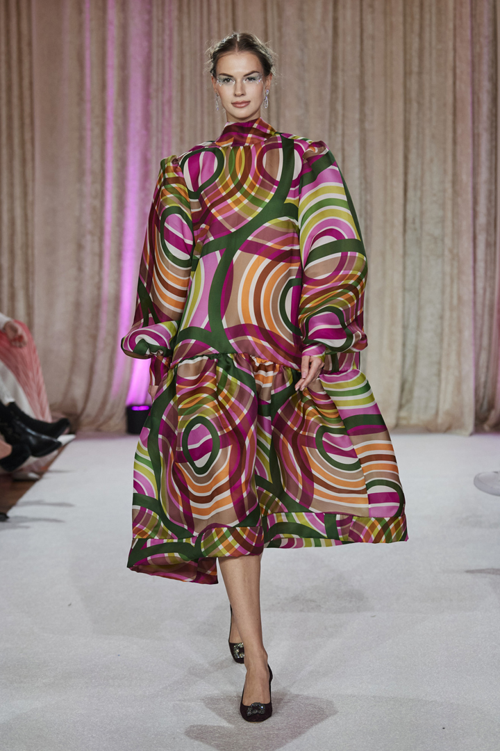 إذا كنتِ تهوين الفساتين الميدي والطويلة بألوانها الزاهية والمختلطة التي كانت تبرز بها نجمات السينما في فترة السبعينيات، فمن المؤكد أن الفستان الـA Line الفضفاض وبدون تحديد للخصر، المزيّن بأكمام منتفخة (Puffy Sleeves) من إبداعات دار ناردوس (Nardos) سينال إعجابك. يمكن تنسيقه مع حذاء أسود صغير الكعب (Kitten Heels) وحمل كلاتش عريض يتماشى مع لون الفستان أو يتبع أحد ألوان نقشته، واختاري أقراطاً متدلية دقيقة لإطلالة مذهلة تعيدك مباشرة إلى زمن السبعينيات.