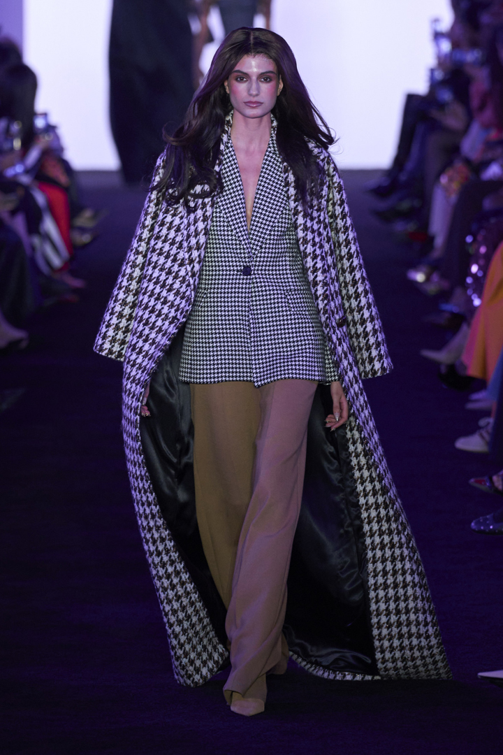 توجد بعض النقوش الكلاسيكية التي تظل رائجة على مر الزمان، قد تغيب في بعض الأحيان لكنها دائمًا ما تعود لتستعيد مكانتها في عالم الموضة. من ضمن هذه النقوش، نقشة الـHoundstooth التي تعتبر إضافة فورية للفخامة والأناقة على أي إطلالة عند استخدامها. لاحظنا هذه النقشة بارزة في تشكيلة سيرجيو هدسون Sergio Hudson، حيث بدت إحدى العارضات مبهرة بمعطف ماكسي يمتد حتى الأرض مطابق مع بليزر بنفس النقشة وبنطال واسع باللون البيج، مكملة إطلالتها بحذاء مدبب من اللون ذاته.