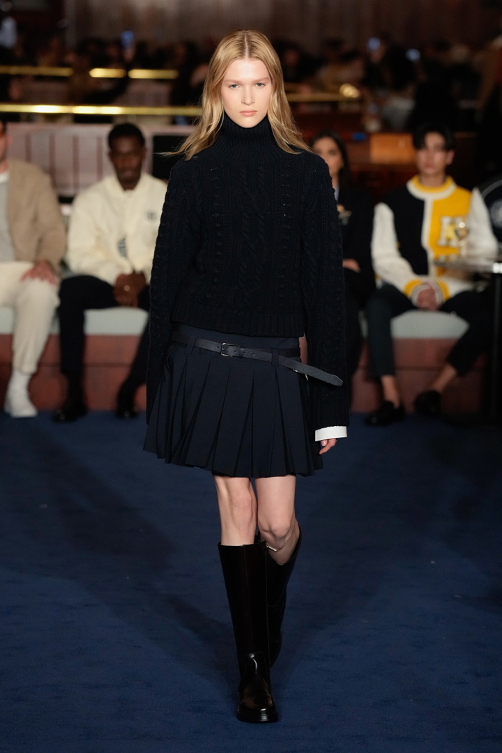 أسبوع نيويورك لموسم خريف وشتاء 2024 – 2025 أحيا مجدداً بعض من أشهر صيحات موضة السبعينات، وفي مقدمتها التنانير القصيرة Mini Skirts، خصوصاً تلك النماذج المنفوشة على شكل A Line. من ضمن هذه الصيحات، برزت التنورة السوداء المقترنة بسويتر بياقة مرتفعة باللون نفسه ضمن مجموعة تومي هيلفيغر Tommy Hilfiger. يمكن تقليد إطلالة العارضة بتنسيقها مع بوت أسود ذو طول متوسط وحمل حقيبة ذات ألوان زاهية.