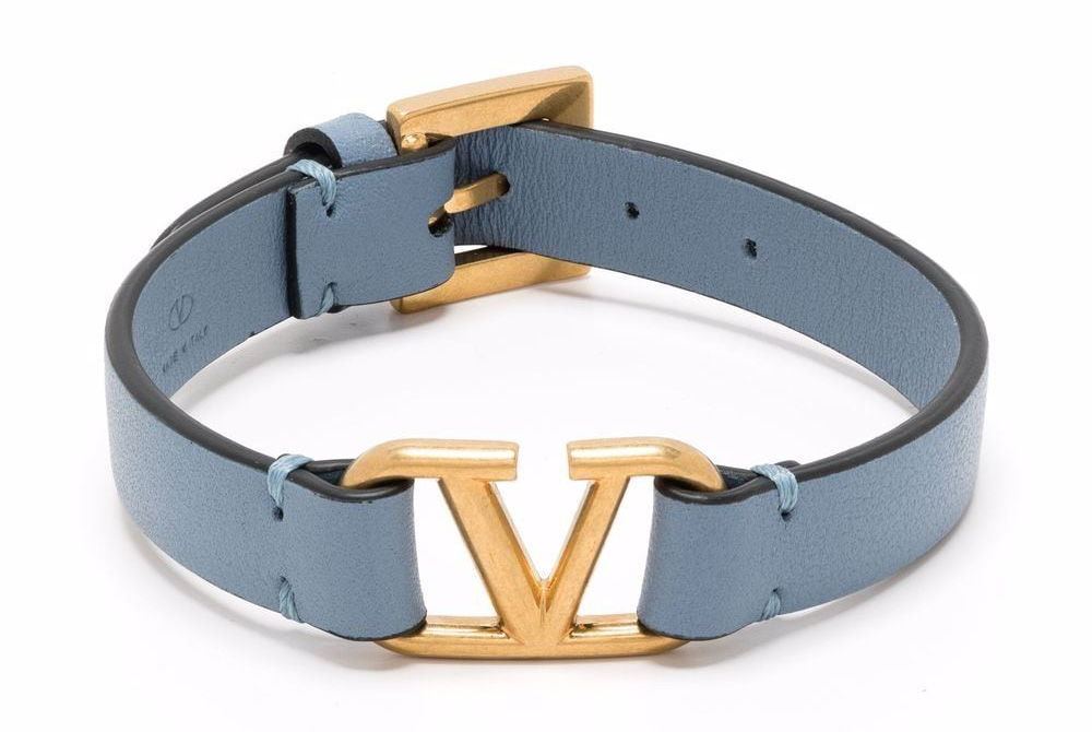 سوار جلدي أنيق باللون الأزرق الساحر، يحمل حرف V باللون الذهبي وهو شعار العلامة المعروفة، وفيه إبزيم باللون الأصفر وهو قابل للتعديل.