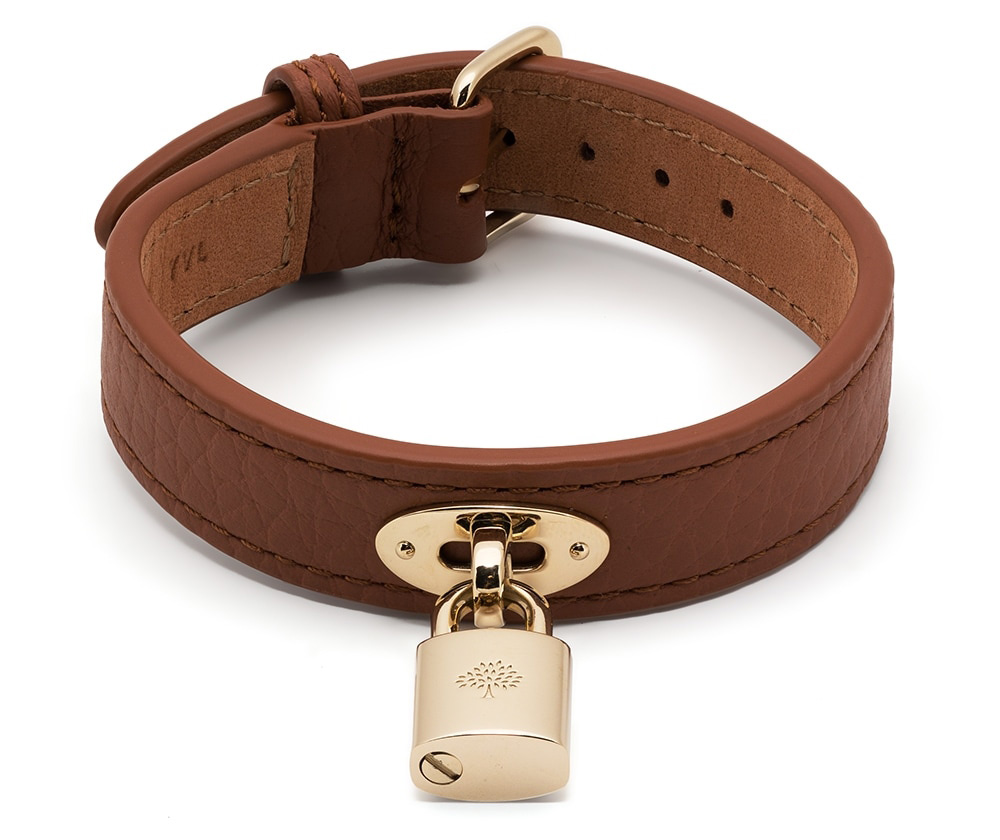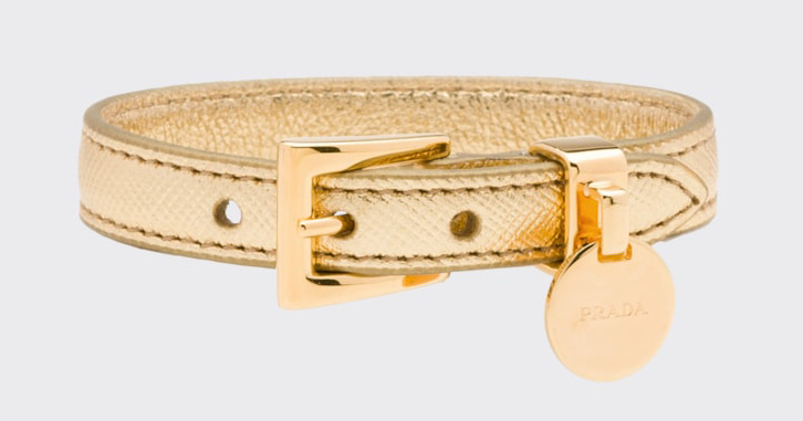 سوار جلدي باللون الذهبي اللامع يحمل إبزيم قابل للتعديل مع حلية دائرية تحمل اسم العلامة.
