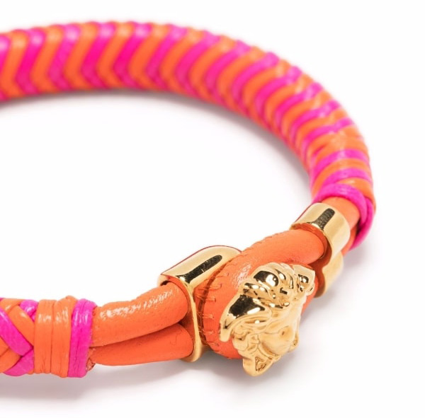 سوار بتصميم مبتكر مصنوع من الجلد باللون الوردي والبرتقالي بأسلوب الضفيرة، السوار يحمل موتيف في المنتصف يحمل شعار العلامة الشهير وهو مطلي باللون الذهبي.
