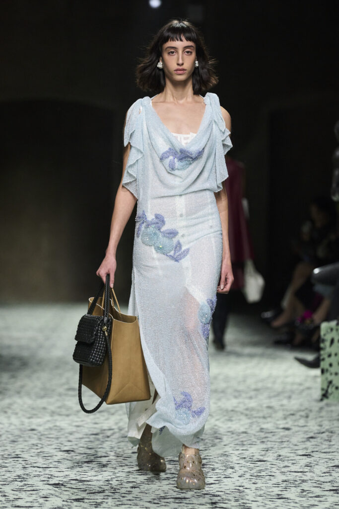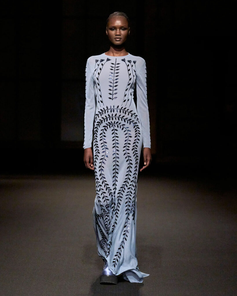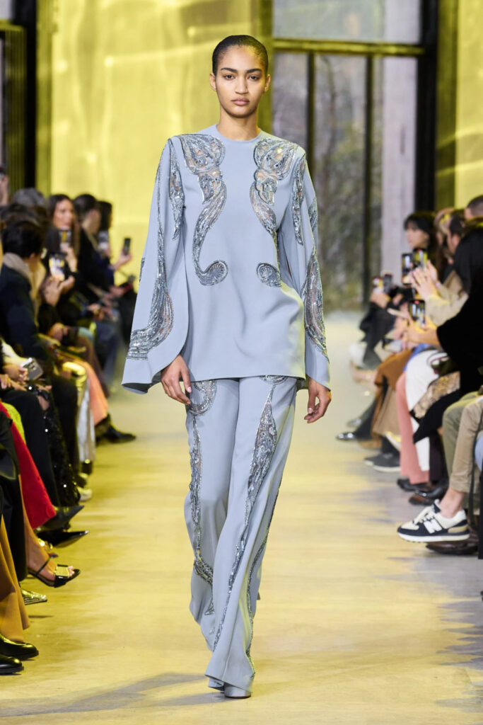 تلك النغمات الرقيقة في السماء، خاصةً تلك التي نشهدها في وقت الفجر حينما يمتزج الضوء بالأرض. ينقل هذا اللون الأزرق الفريد الرقي والعصرية لمن يسعون للتميز بعيداً عن الخيارات التقليدية للأزرق الغامق؛ فالأزرق الفاتح يقع بين الألوان، وفي مجموعات الخريف والشتاء لعامي 2023 – 2024 نجده يضفي بهجة ورقة على أقمشة كالحرير والدانتيل المفصل وحتى على الأقطان الثقيلة. هذا الظل المميز من الأزرق يمنح أي إطلالة لمسة من الخفة والنضارة والرقة، سواء في البنطلونات الفضفاضة، الفساتين الطويلة، الفساتين الواسعة أو حتى البلوزات البسيطة.