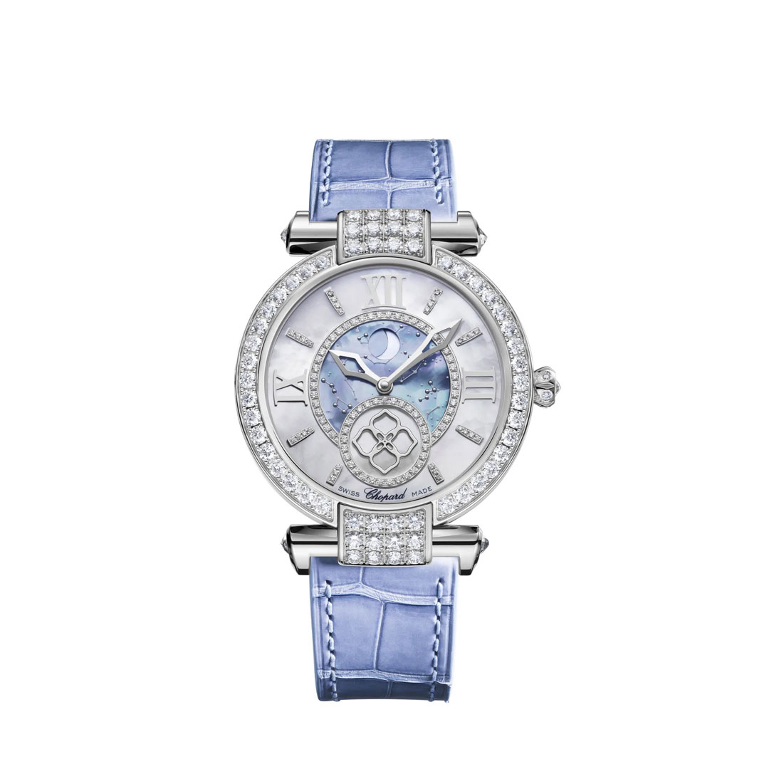 مجموعة إمبريالي (Imperiale) من شوبارد (Chopard) تجسد تصميماً متميزاً بالأناقة والحسية والرقي، مستوحى من حقبة الإمبراطوريات العظمى. ضمن هذه المجموعة الفاخرة، تأتي ساعة Imperiale Moonphase كتحفة فنية معقدة، تتميز بميناء مصنوع من عرق اللؤلؤ مزين بالألماس، يعرض المراحل المهيبة للقمر وكواكب النصف الشمالي من الكرة الأرضية.