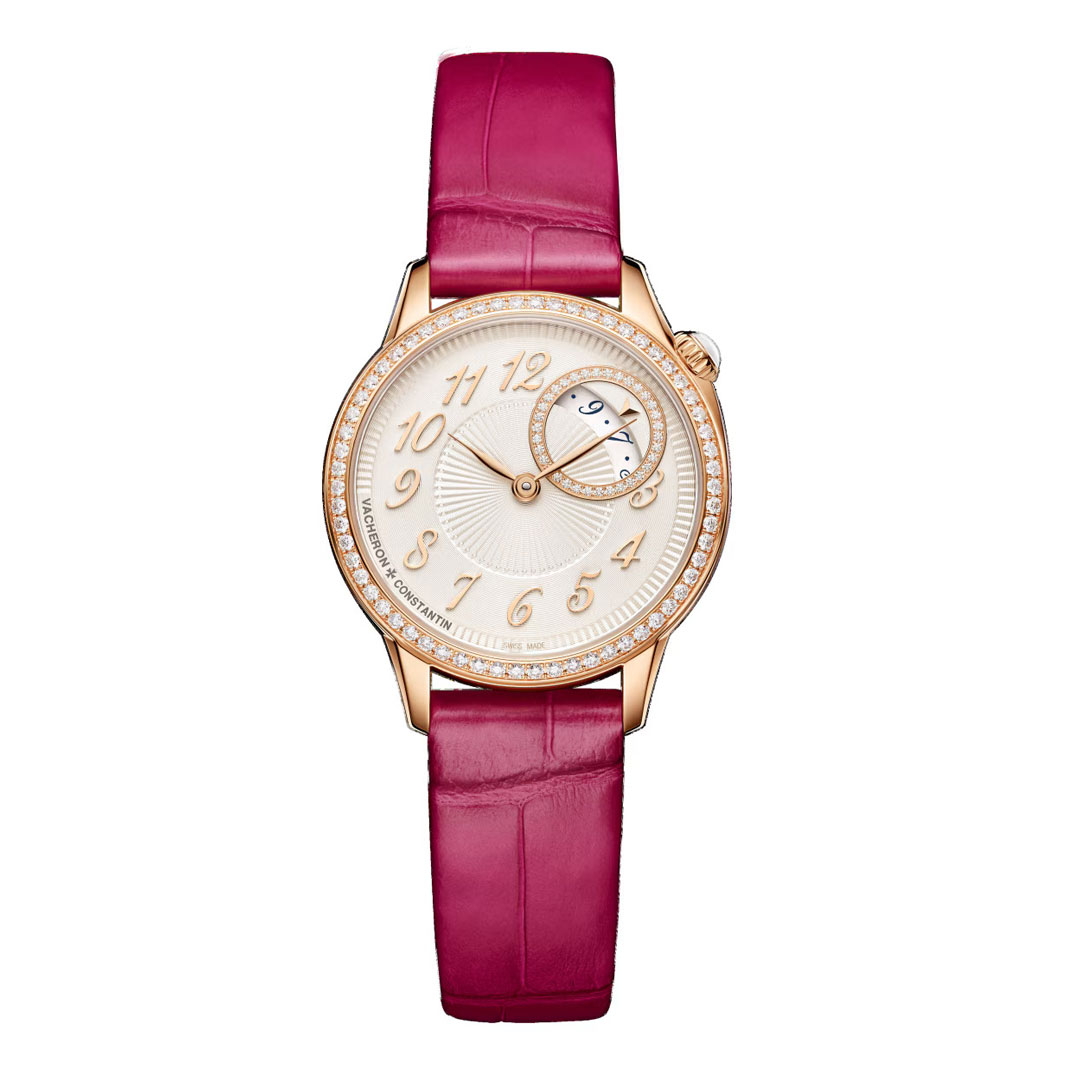 تأتي الساعة بثلاثة أحزمة قابلة للتبديل مصنوعة من جلد التمساح، لتوفير مجموعة متنوعة من الإطلالات الساحرة. يظهر الحزام باللون الفوشيا المائل إلى الأحمر، مما يضفي لمسة جريئة ولافتة للنظر.