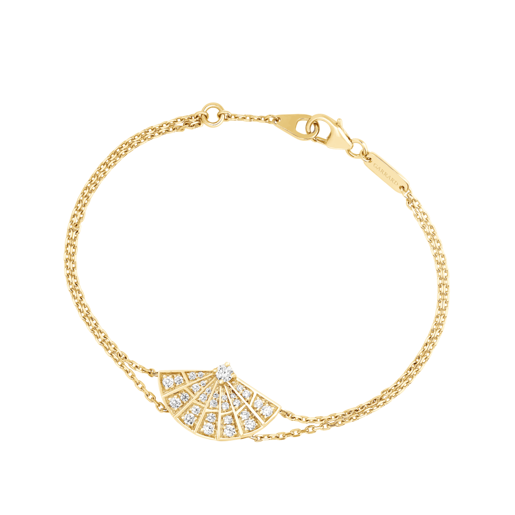 يتميز سوار Fanfare Symphony Mini Icons من Garrard بتصميم فاخر لنقشة المروحة الشهيرة، حيث تحاكي الألماسات المشعة ثنيات المروحة في الذهب الأصفر عيار 18 قيراطًا. يجمع هذا التصميم العصري بين الأناقة وسهولة الارتداء، مما يجعله إضافة مثالية لمجموعتك. السوار مصنوع من الذهب الأصفر عيار 18 قيراطًا، ويحتوي على ماسة مستديرة واحدة بوزن إجمالي 0.06 قيراط، و28 ماسة مستديرة بوزن إجمالي 0.26 قيراط.