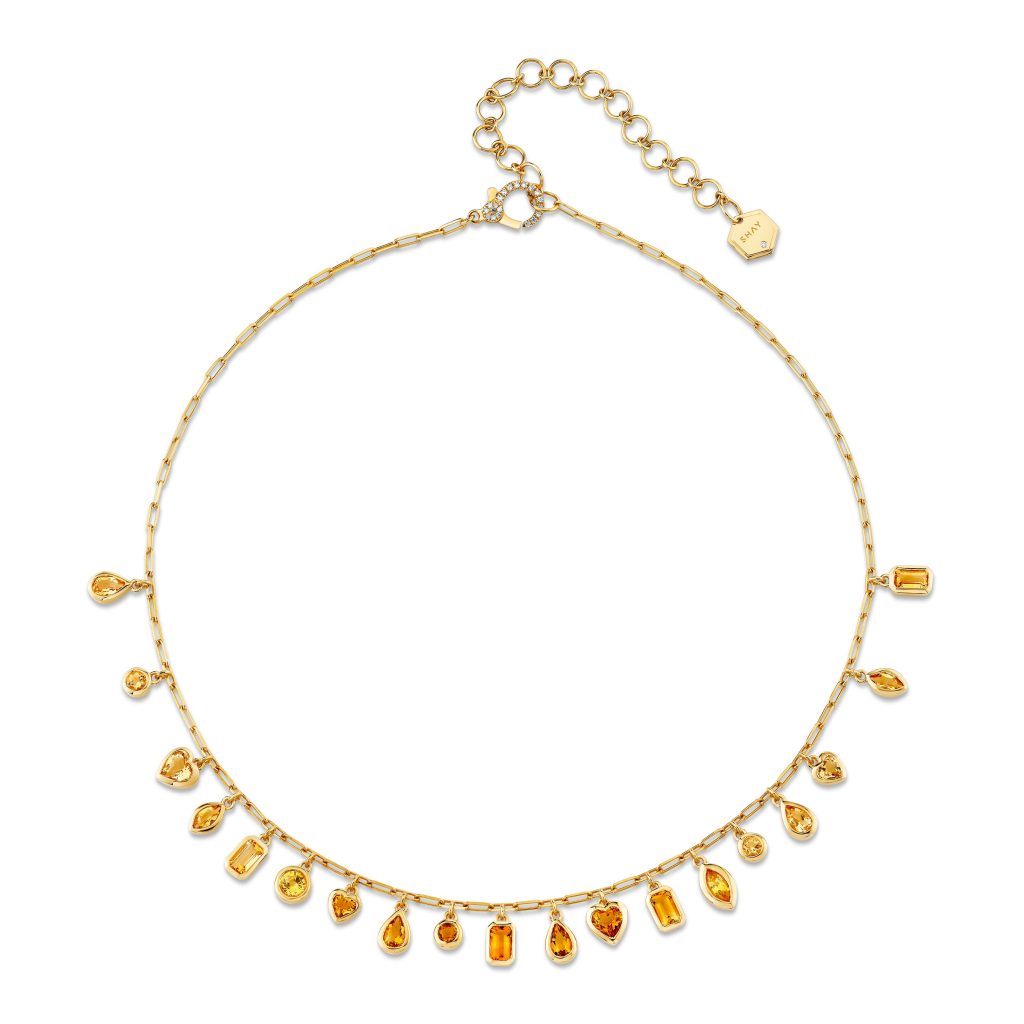 تتميز قلادة Bezel Mixed Drop من Shay بسحر لا يُقاوم، حيث تزين العنق بأسلوب عصري ولافت للنظر، خاصة مع أشكال الأحجار البرتقالية المتدلية منها. القلادة مصنوعة من الذهب الأصفر عيار 18 قيراطًا، ومرصعة بألماس أبيض بوزن 0.19 قيراط، ومزيج من السترين والياقوت الأصفر بوزن إجمالي حوالي 4 قيراط. تتنوع تصاميم الأحجار بين الشكل الكمثري والقلب والمستدير والمستطيل، بالإضافة إلى قطع الماركيز. ستبدو رائعة مع كنزة شتوية ناعمة أو فستان بسيط، ويمكنك تكديسها مع سلسلة قصيرة لمزيد من الأناقة.