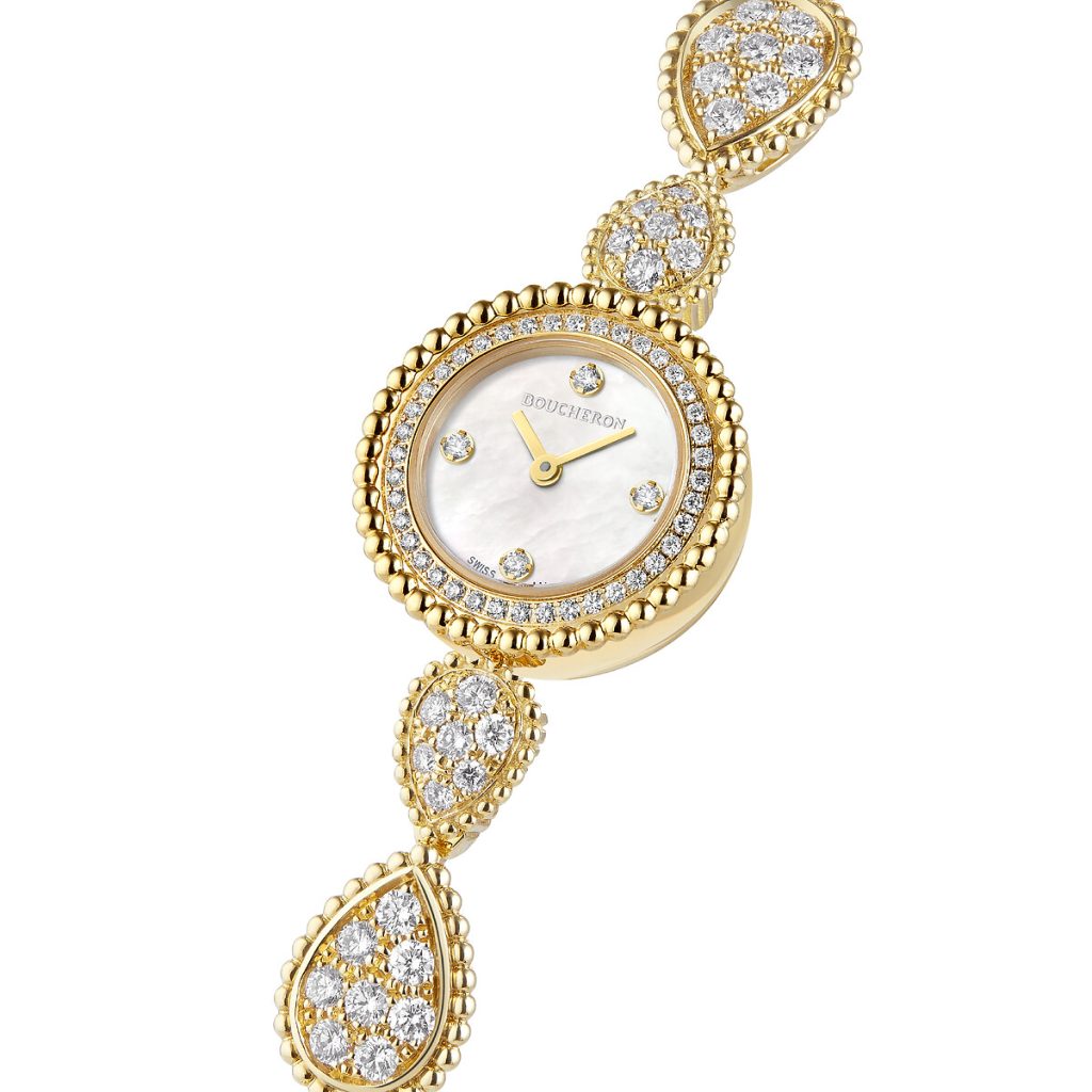 قدّمت دار Boucheron ساعة Serpent Bohème برؤية مستوحاة من هيئة الأفعى، حيث تتعانق حبات الألماس مع الذهب الأصفر بتصميم إبداعي. تظهر تفاصيل خلية النحل لتبرز بريق الألماس، فتؤكد البراعة الحرفية لدار بوشرون. وبهذه التفاصيل المبتكرة، تتجاوز الساعة حدود الزمن لتصبح قطعة مجوهرات آسرة.