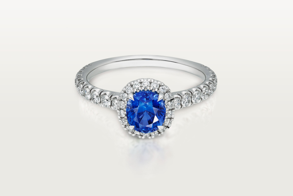 دار كارتييه تقدم هذا الموسم خاتم Cartier Destinée السوليتير، المصنوع من البلاتين والمرصع بياقوتة بيضاوية (بين 1.00 و3.49 قيراط)، محاطة بألماسات مصقولة بدقة.