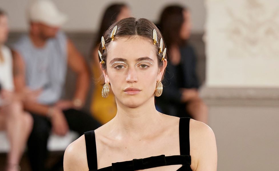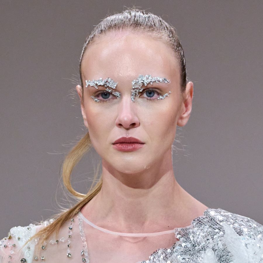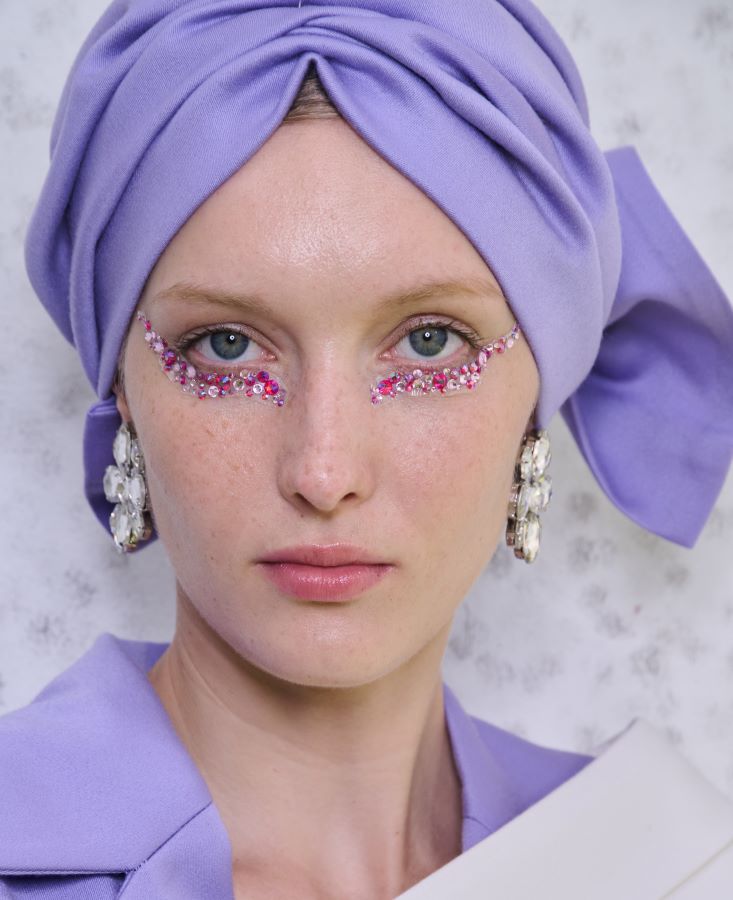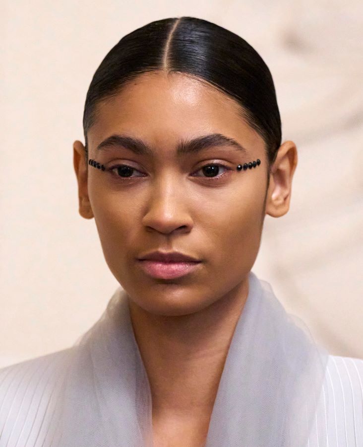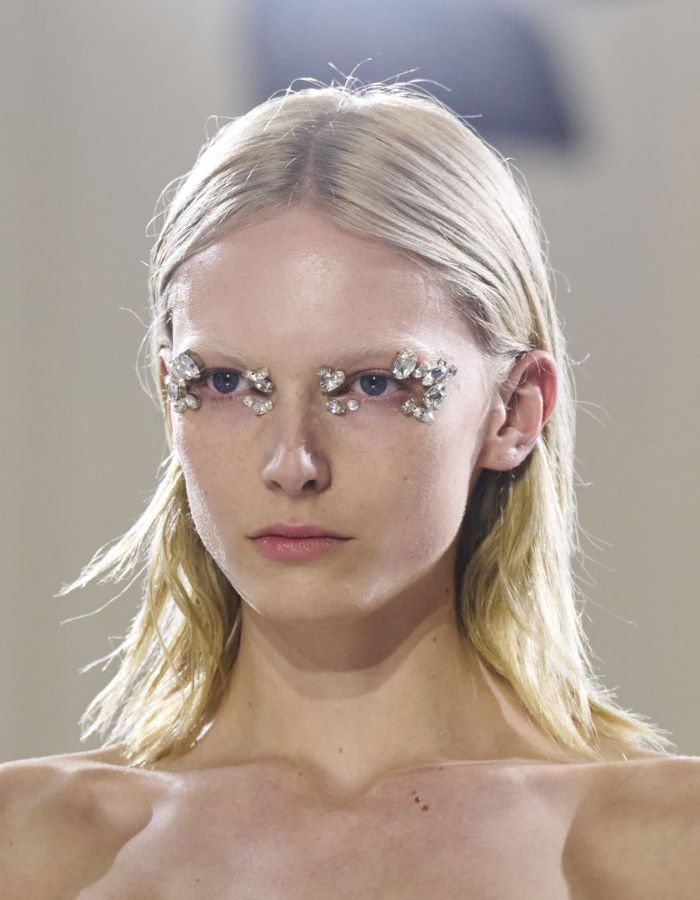 يمكنك أيضًا التميز بإطلالة مكياج البيج المات المرصع بحبات الستراس، لتحصلي على مظهر يجمع بين النعومة والرقي. قومي بتطبيق ظل العيون البيج الفاتح المات على كامل الجفن العلوي وثنية العين، وكذلك تحت الجفن السفلي، ثم استخدمي الماسكارا البنية لتكبير العين. زيني منطقة تحت الحاجب بحبات الستراس الفضية الصغيرة على شكل خط نصف دائري، واعملي على تغطية خفيفة لبشرتك مع إبقاء الشفاه طبيعية. استلهمنا هذه الصيحة من عرض دار باتو Patou في أسبوع الموضة في باريس لربيع وصيف 2024.