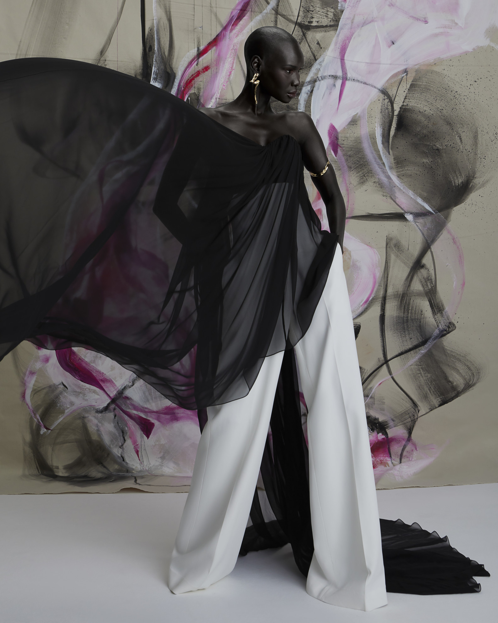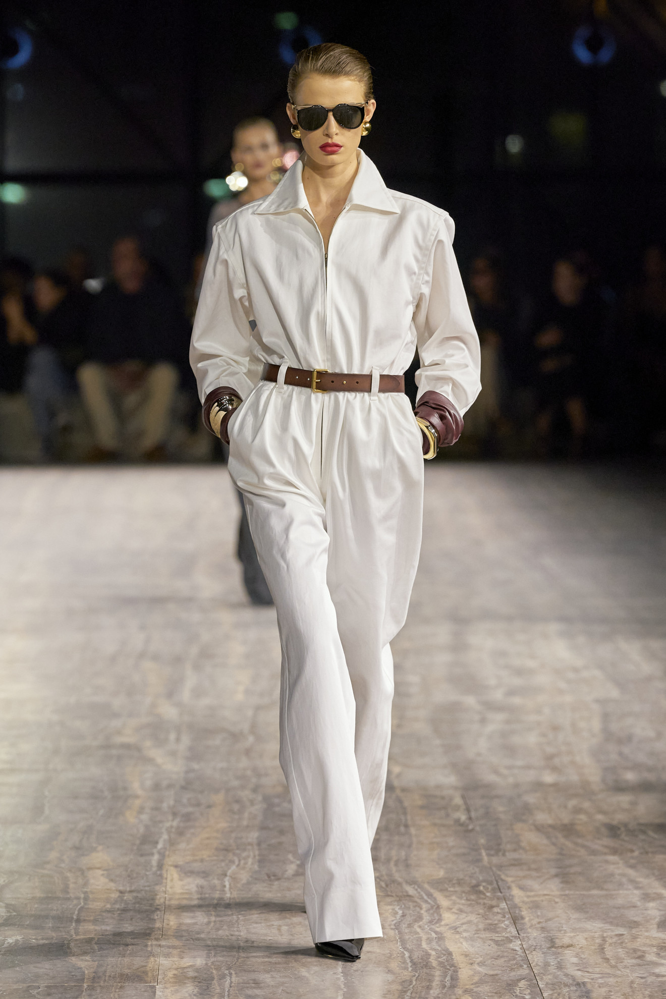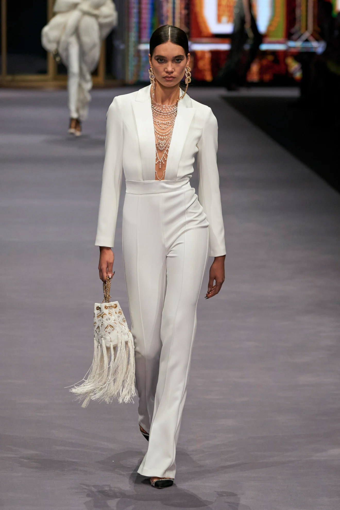 يُعتبر الجمبسوت بتصميمه الأساسي ملائمًا لمعظم أشكال الأجسام. لمزيد من الثقة في الاختيار، يُفضل اختيار تصميم بسروال مستقيم يتسم بالانسيابية دون أن يكون ضيقًا جدًا أو فضفاضًا بشكل مبالغ فيه. يمكن الاعتماد على تصميمات إيلي صعب، مثل جمبسوت بأكمام غير متطابقة أو بكم واحد طويل، وبلوزة مزينة بتطريز الورود الكبيرة التي تغطي جزءًا من الكتف. هذا النوع من التصميم يساعد على إخفاء العيوب في الجسم ويبرز القوام بشكل عام.