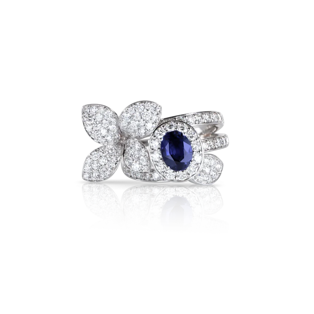 يجسّد خاتم Butterfly من Graff براعة حرفية استثنائية، حيث تتألف الفراشات من أحجار ألماس بقَطع الكمثرى والماركيز، صِيغت بانحناء أنيق يلتف حول الإصبع. يرمز التصميم إلى التحول والحرية والقوة الداخلية، فيما يبلغ الوزن الإجمالي للألماس نحو 2.20 قيراط، ما يمنح الخاتم حضوراً لافتاً يجمع بين الفخامة والرقة.
