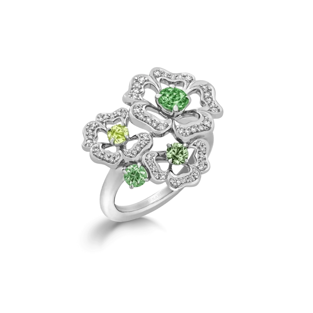 يحتفي خاتم Tudor Rose Petal Tourmaline من Garrard بتدرجات التورمالين الأخضر المتلألئة، التي تتناغم مع الألماس في تصميم مستوحى من وردة تيودور التاريخية. يترجم الخاتم هذا الرمز العريق إلى لغة معاصرة تعبّر عن التآلف والانسجام، ما يجعله قطعة فنية مميزة تضيف بعداً تاريخياً ولونياً إلى أي تنسيق أنيق.