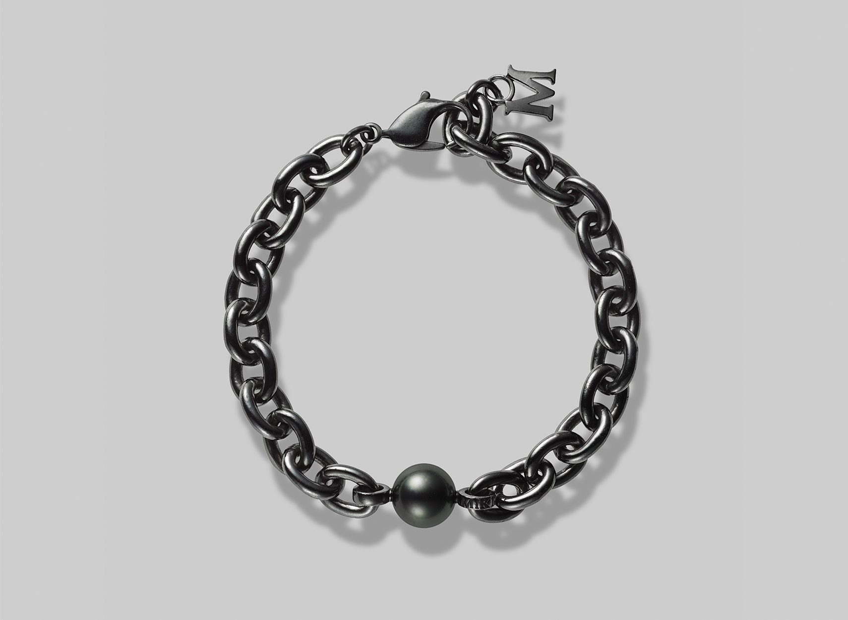 سوار على شكل حلقات مترابطة مصنوع من الفضة المطلية بالروديوم الأسود. مزين بحبة من اللؤلؤ الأسود الجذاب.