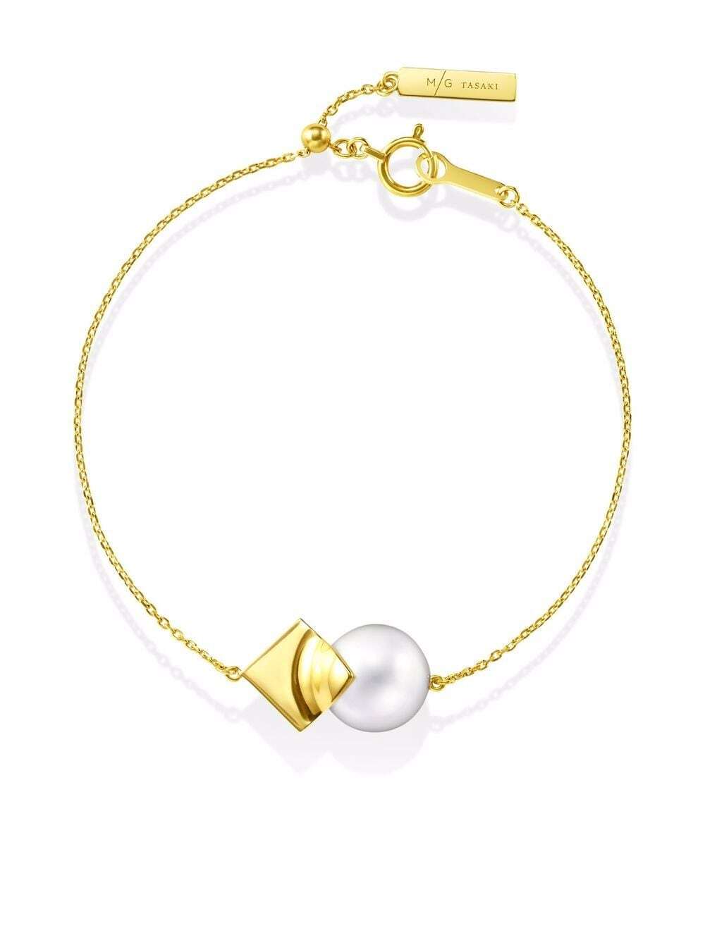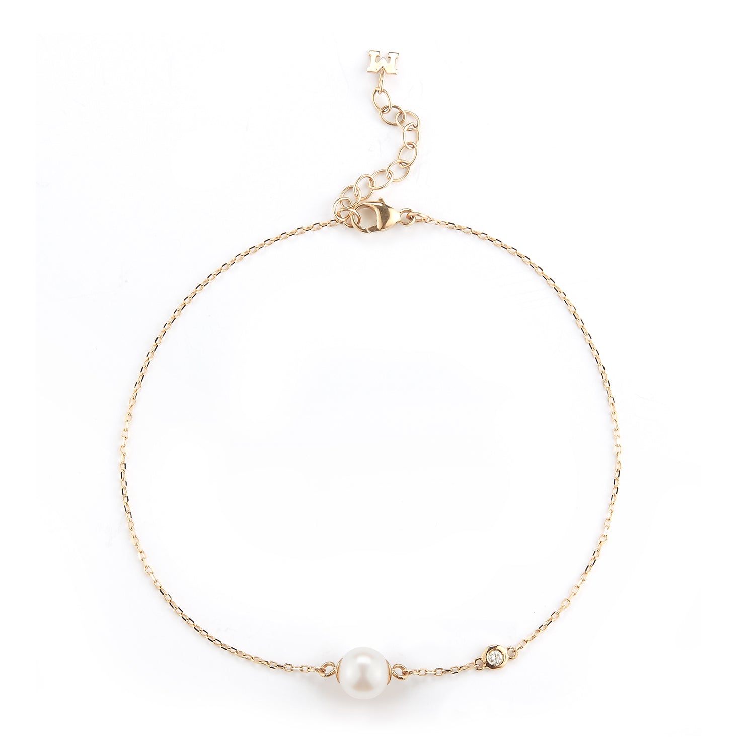 سوار ذهبي راقي بتصميم بسيط تتوسطه حبة من اللؤلؤ الأبيض مع لمسة صغيرة من الماس البراق بقطع دائري.