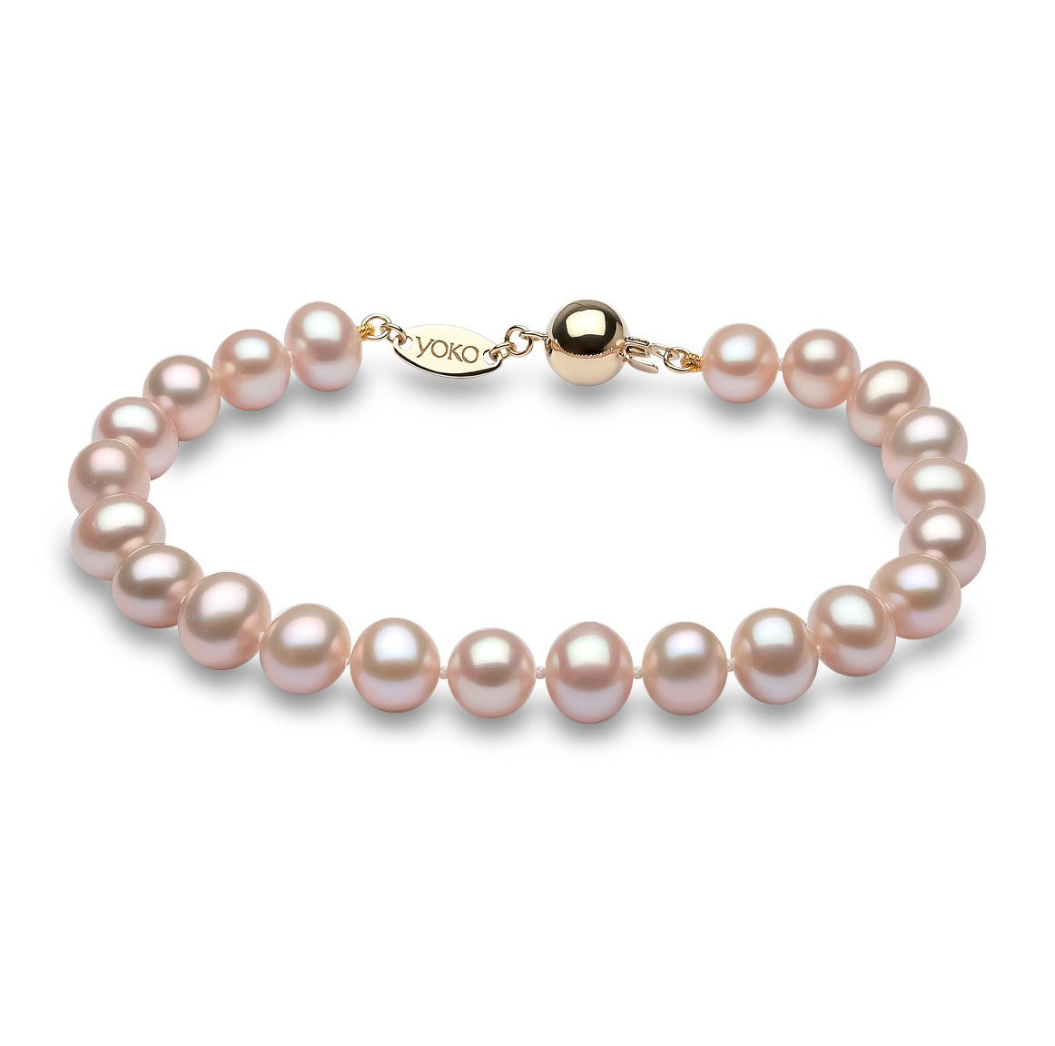 سوار فاخر من المعدن الأصفر النفيس يحمل مجموعة من اللؤلؤ باللون الوردي.
