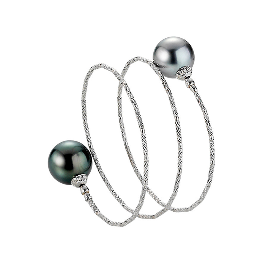 سوار جذاب من الذهب الأبيض بتصميم قابل للف على المعصم والتعديل حسب الحجم المطلوب، السوار يتضمن قطع من اللؤلؤ باللون الأسود عند نهاية الطرفين.