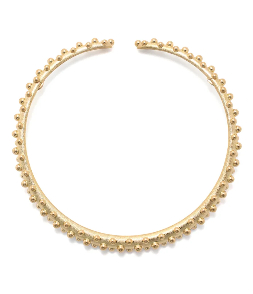 يجمع هذا العقد بين الفخامة والبساطة في آن واحد؛ حيث يتزين بكرات الذهب البارزة التي تبدو مثل الخرز، ما يضفي لمسة من التألق والحيوية على إطلالاتك اليومية أو المسائية. يمكنكِ تنسيقه مع فستان ناعم أو قميص بسيط لإبراز فخامته.