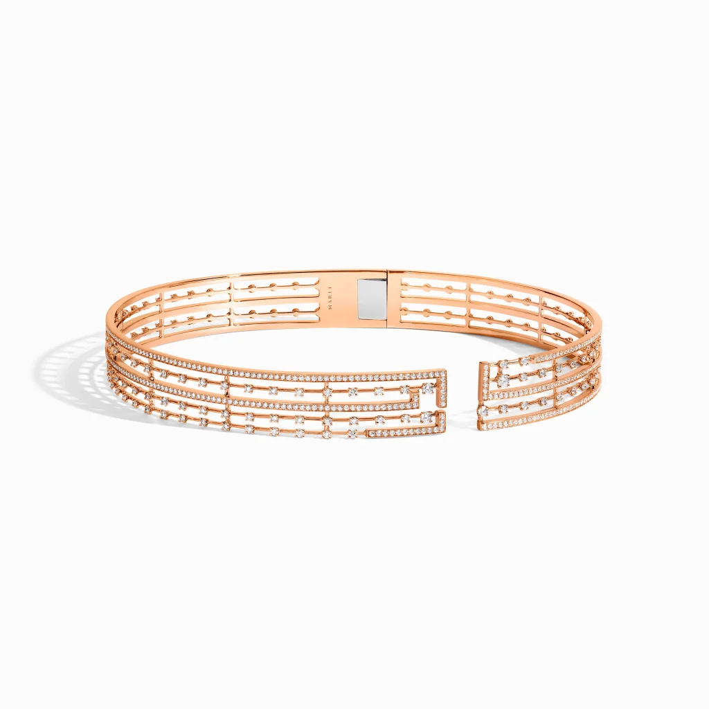 يأتي عقد Avenues Hinged من مارلي نيويورك بتصميم لافت للأنظار يعتمد على صيحة الطبقات، وهو مصنوع من الذهب الوردي عيار 18 قيراطاً، يلتف حول الرقبة بأسلوب التشوكر (Choker) ليسلّط الضوء على جمال وجهك، ويزداد سحراً بأحجار الألماس المستديرة بوزن 5.40 قيراط.
